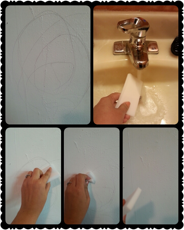 Apply a little bit of warm water on Magic Easter and gently rub against the mark. The mark should instantly clean off. If it not come off add a little bit of dish soap.That would help to make the mark easily.